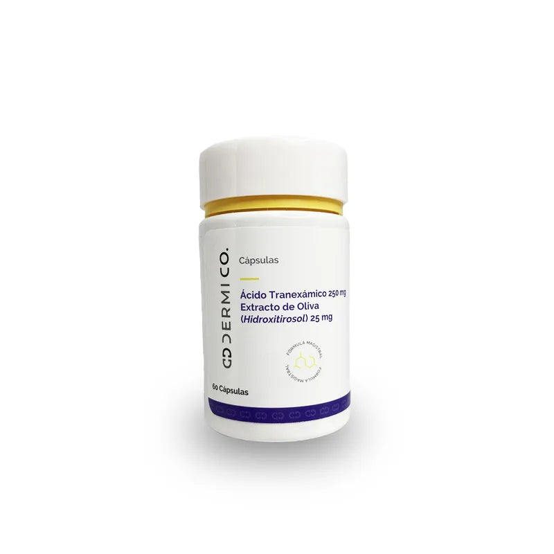 Cápsulas formuladas con ácido tranexámico y extracto de oliva (hidroxitirosol) para el tratamiento de la hiperpigmentación, melasma y manchas postinflamatorias. Actúa sobre la producción de melanina y ofrece protección antioxidante.